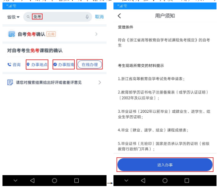 ①搜索“免考”,了解办事地点、办事指南后“在线办理”;阅读“用户须知”,“进入办事”