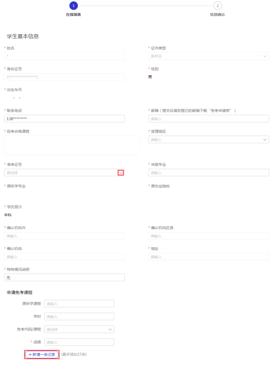 系统根据准考证号默认考生提交材料的确认机构,有二个或以上准考证号的考生按实际常驻地等情况选定用于免考申请登记的准考证号,避免跨地区提交免考申请材料。数门课程申请免考,“新增一条记录”增加一门课程。