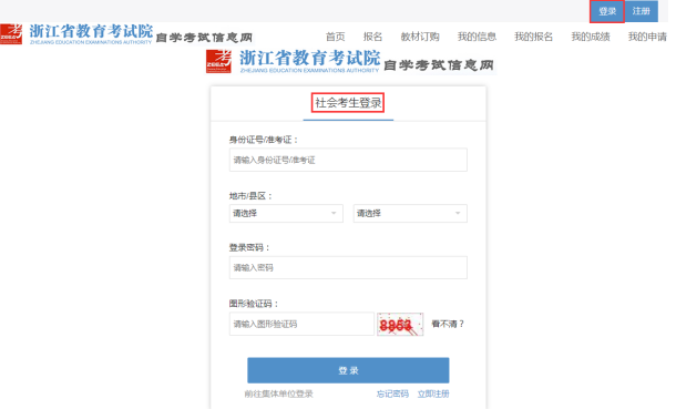 考生在浙江省教育考试院自学考试信息网(zk.zjzs.net)“社会考生登录”界面使用身份证号或准考证号登录。由于身份证号或密码错误无法登录,首次登录系统的考生,请与当地教育考试机构联系;原已登录过系统的考生,通过“忘记密码”功能自行重置密码。