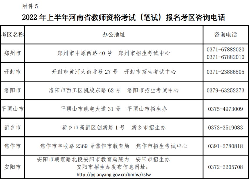 2022年上半年河南省教师资格考试(笔试)报名考区咨询电话