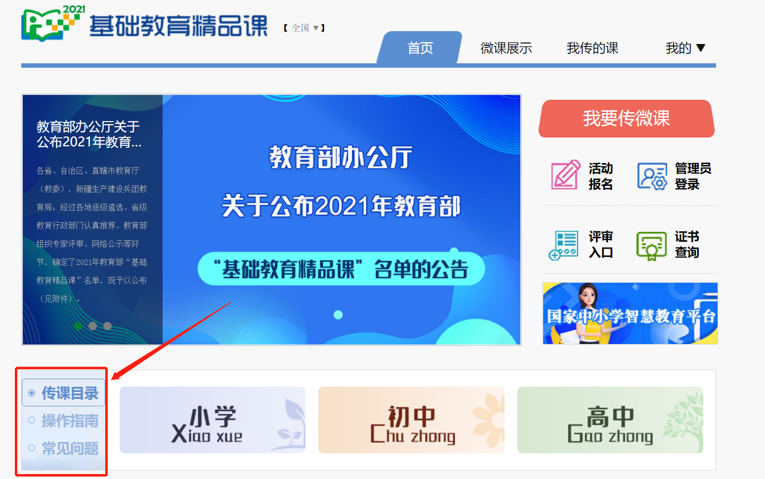 如果只是游客,不进行传课等操作,若想获取资源:可直接点击平台首页——微课展示——部级精品课展示。栏目中收藏了2422节部级精品课,是供师生学习的优质教育资源平台。可通过筛选“学段”“学科”“册次”“版本”等获取相关教学视频。