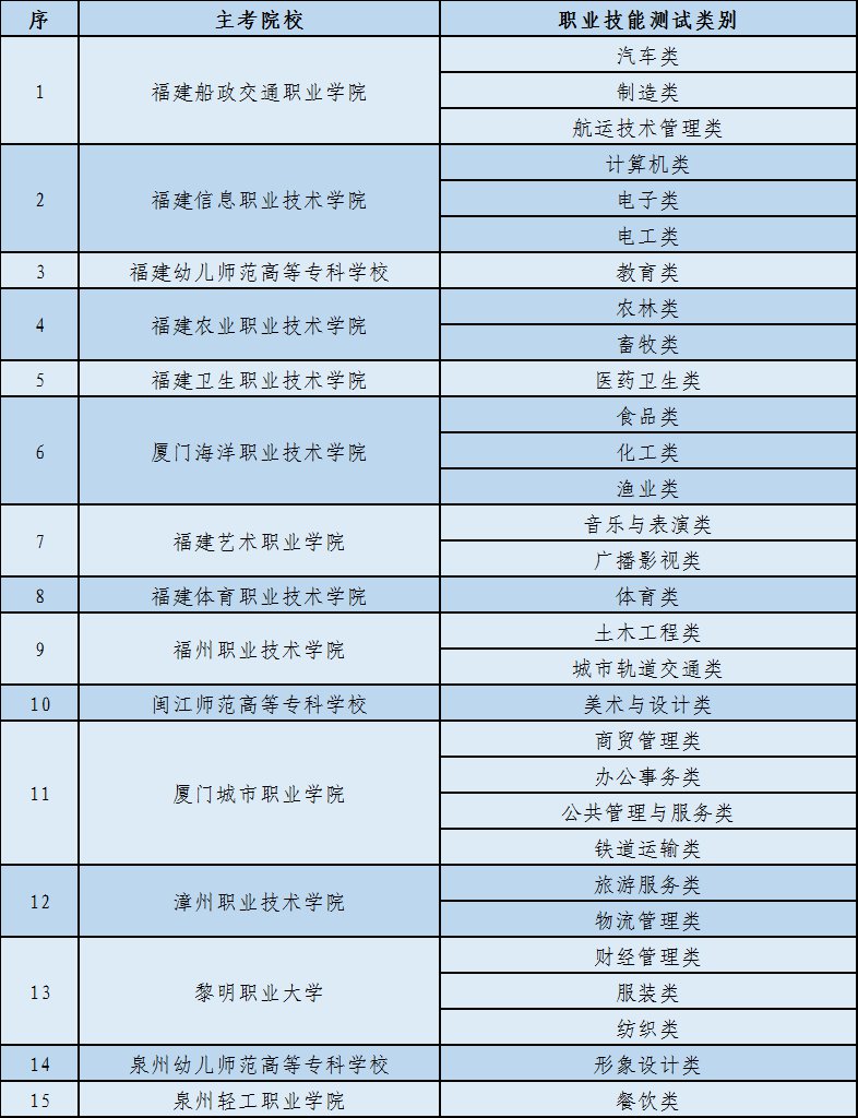 2022年福建省高职院校分类考试招生职业技能测试主考院校名单