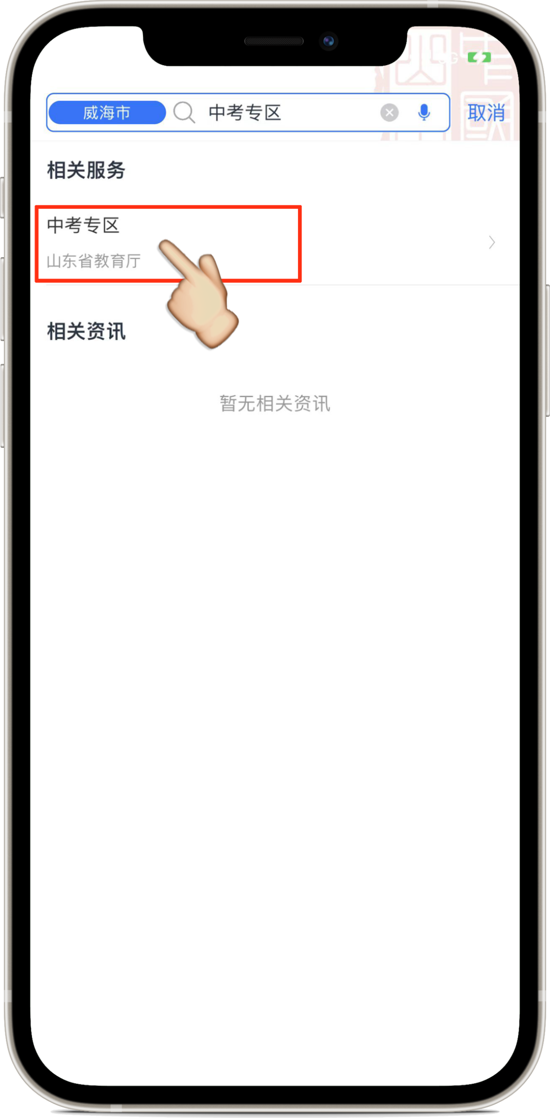 1.打开“爱山东”APP,在首页左上角选择进入“威海市”,然后搜索“中考专区”,点击进入。