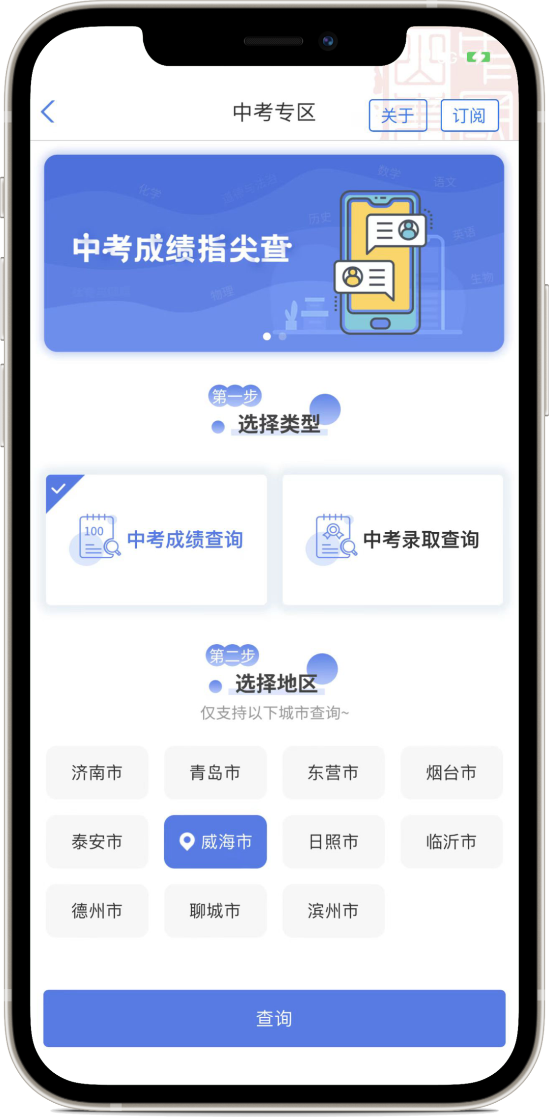为方便我省考生及家长更好更快地查询中考成绩及录取结果,省教育厅联合省大数据局依托“爱山东”政务服务平台,通过渠道整合、集中发布的形式,上线覆盖全省16市的“中考专区”。实现全省中考服务统一入口“指尖查”,全面助力中考,护航莘莘学子。