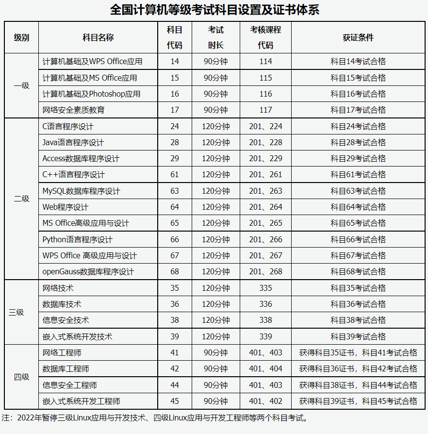 1.2022年暂停三级Linux应用与开发技术、四级Linux应用与开发工程师等两个科目。2021年下半年已通过四级Linux考试的,成绩保留至2023年3月。