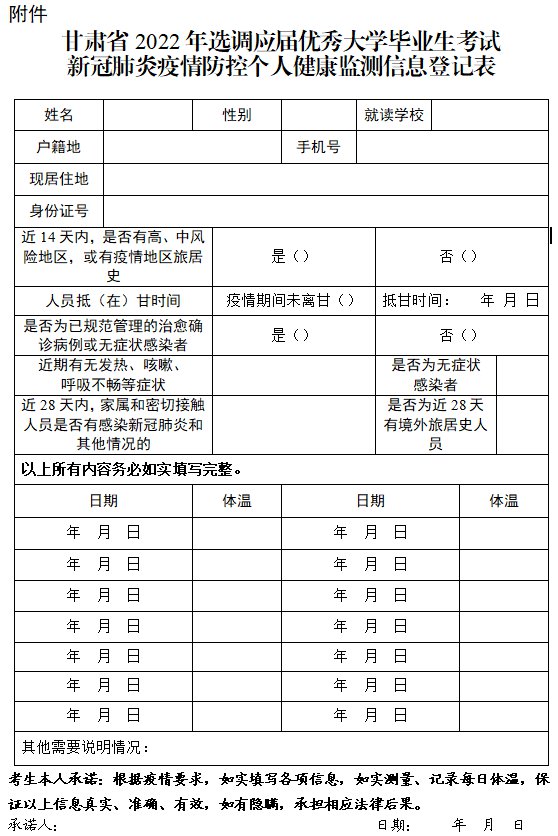 1、请所有参加考试的人员,做好自我健康监测。从考前14天开始,每天测量体温,如实填写《甘肃省2022年选调应届优秀大学毕业生考试新冠肺炎疫情防控个人健康监测信息登记表》(见附件)。
