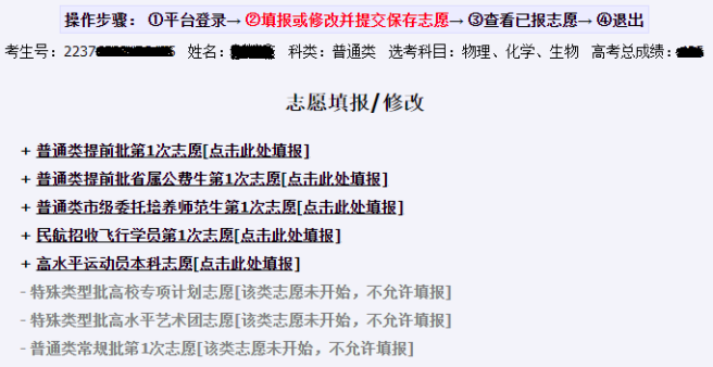 系统以颜色区分不同内容:红色字体显示本批次志愿填报注意事项,黑色字体显示考生可填报的志愿菜单、灰色字体显示本阶段未开始或已结束的志愿菜单、蓝色字体显示已填报的志愿菜单。