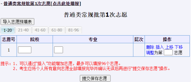 这里可手工输入志愿信息,如在志愿辅助系统保存过志愿预填表,可点击“导入志愿预填表”,系统提醒考生确认,如下图: