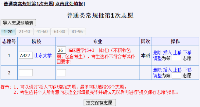 这里,考生还可对志愿进行增加、修改、插入、删除、上移、下移、调整顺序等操作。在调整顺序时,考生可输入“调整为第_志愿”直接调整志愿顺序,例如:输入1,按“回车”键或点击“调整”,志愿将调整到第1志愿。