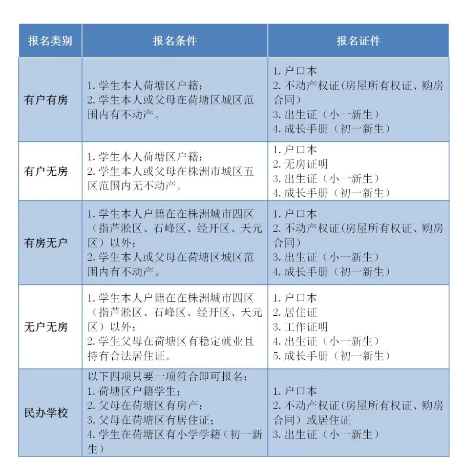 1.有户有房、有户无房、有房无户。户口本、不动产权证(或房屋所有权证、购房合同)、有户无房提供法定监护人无房证明,小学一年级新生需提供出生证。2. 无房无户。户口本、居住证、工作证明(工作证明需提供在荷塘区合法有效的正规劳务合同,并由用工单位法人代表签字盖章;个体经营者可提供工商税务证代替;网络经营者须提供纳税证明),小学一年级新生需提供出生证。