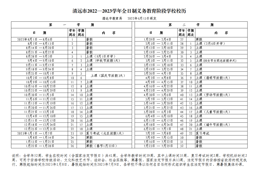 说明:全学年52周,学生在校时间(含国家法定节假日)共41周。全学年教学时间39周,其中上课时间35周,复习考试时间2周,学校机动时间2周,可用于安排学校传统活动、文化科技艺术节、运动会、社会实践等。寒暑假、国家法定节假日共13周。法定节假日的安排按省政府的规定执行。寒假起始时间为2023年1月8日,暑假起始时间为2023年7月9日,各学校不得以任何名目任何形式组织学生在法定节假日、寒暑假集体补课。