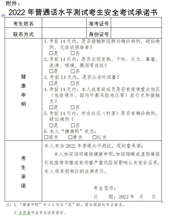 》》》点此下载:2022年普通话水平测试考生安全考试承诺书