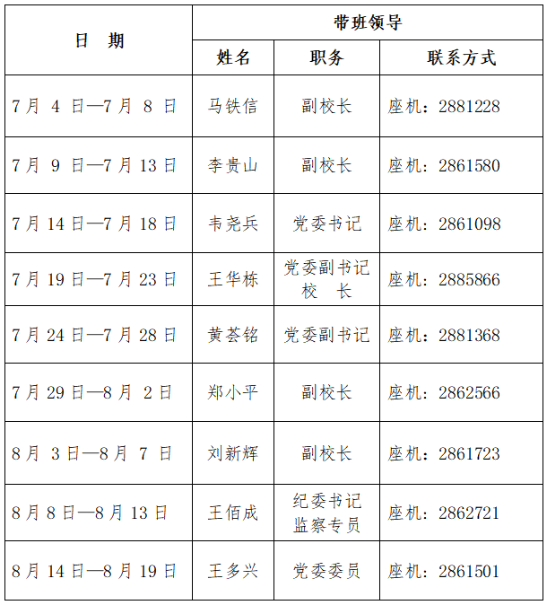 7.教务处、学生处、团委分别组织开展好招生录取、学生军训、社会实践活动。其他需要在假期期间完成的工作任务,各部门、各单位要自行安排好工作进度,确保各项工作顺利开展。