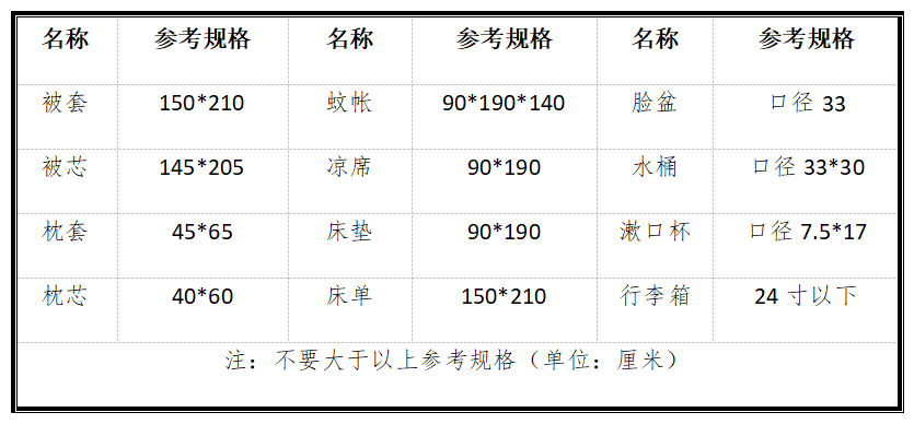 方式二:自行选购。可按照表格里的尺寸自行购买,在开学报到时带来学校。