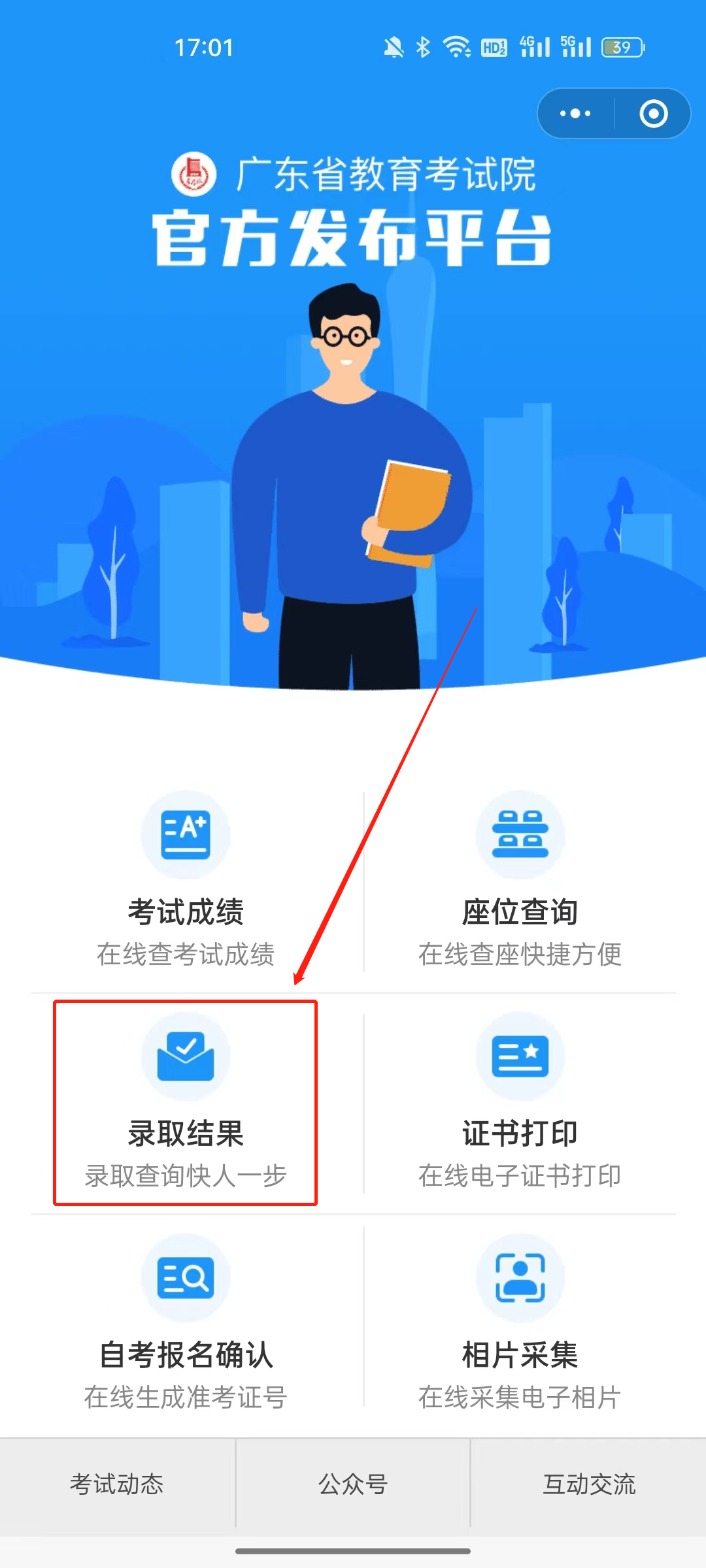 考生可关注广东省教育考试院微信公众号,在页面底部选择“小程序”栏,通过考生号和密码登录即可查询考生录取结果。
