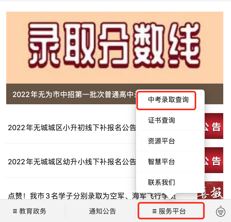 在无为市教育公众号菜单栏点击服务平台➡️中考录取查询,考生输入准考证号、座位号及验证码,即可查询无为市2022年中招录取结果。