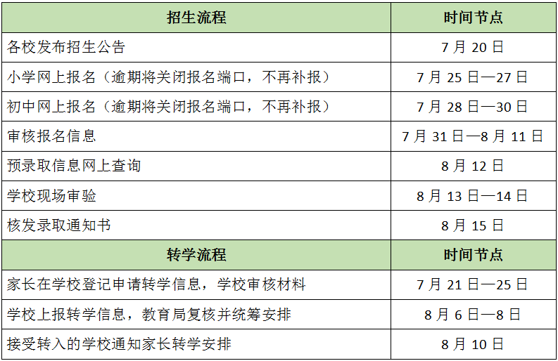7月21日—7月25日家长应持有效证明材料的原件和复印件(城区学校申请需携带房产证、户籍本,随迁子女申请乡镇学校需携带居住证、户籍本)向各校提交转学申请,学校登记信息并做好材料审核工作。8月6日-8月8日学校上报转学信息,教育局复核并结合各校的学位空余情况,统筹安排转学事宜。8月10日接受转入的学校通知家长转学安排。