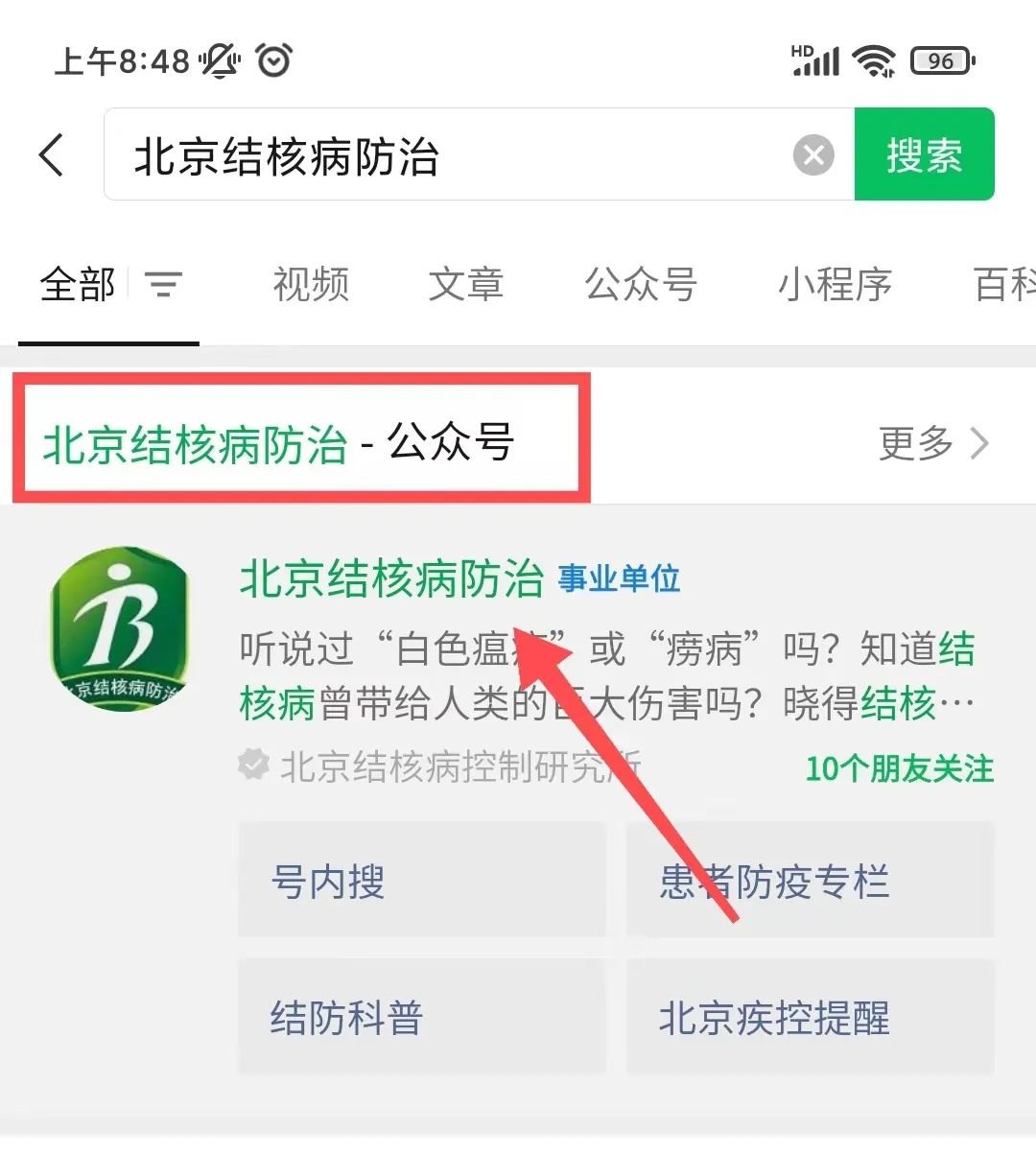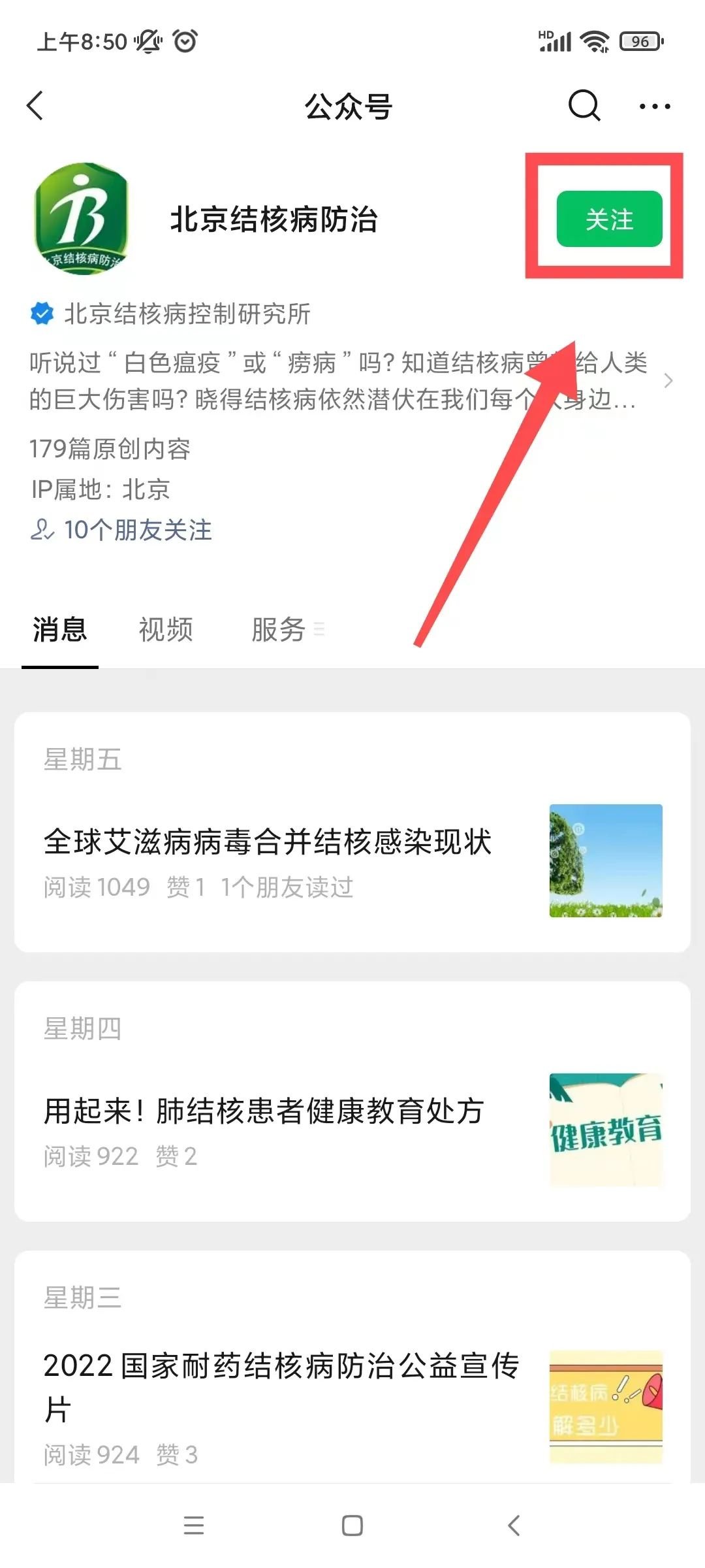 1、搜索“北京结核病防治”微信公众号,点击“关注”进入界面。