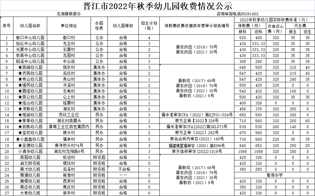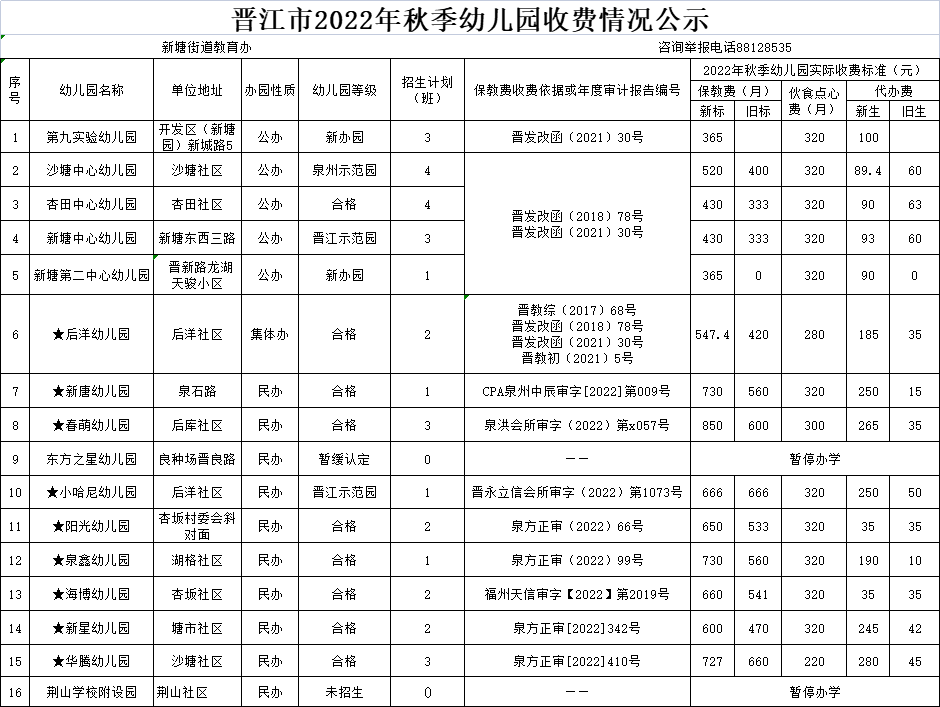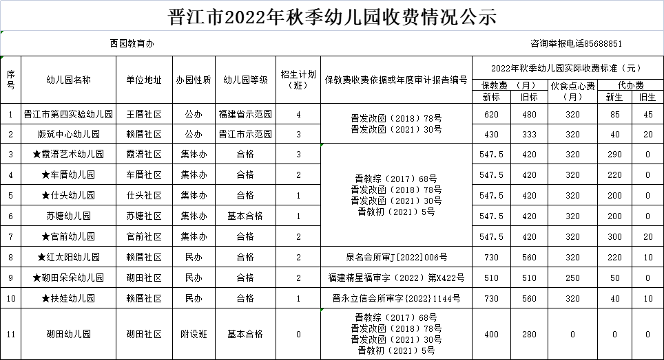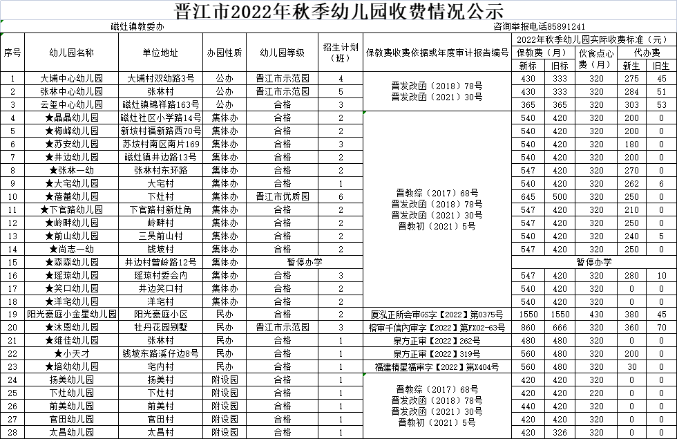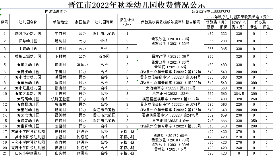 6.根据《晋江教育局关于调整晋江市普惠性幼儿园保育教育费收费标准指导价的通知》(晋教初〔2021〕5号)精神,从2021年秋季起入园的幼儿保育教育费执行新的收费标准(称为新标)。公示表中的新生“代办费”仅指幼儿刚入园的第一个学期按“新生”标准收取。