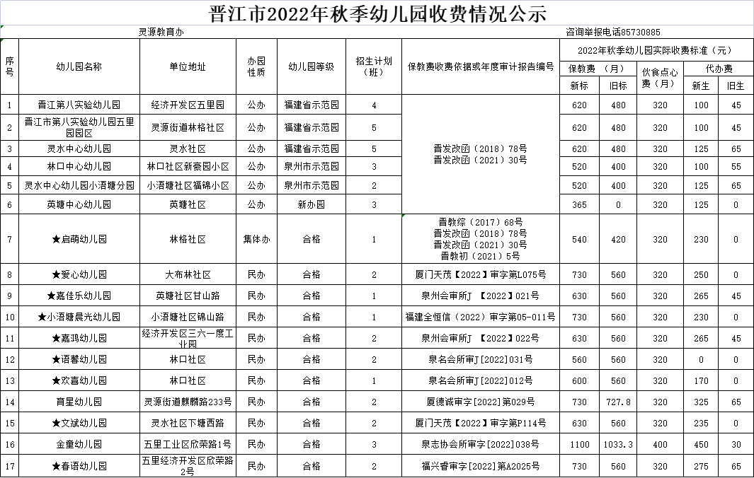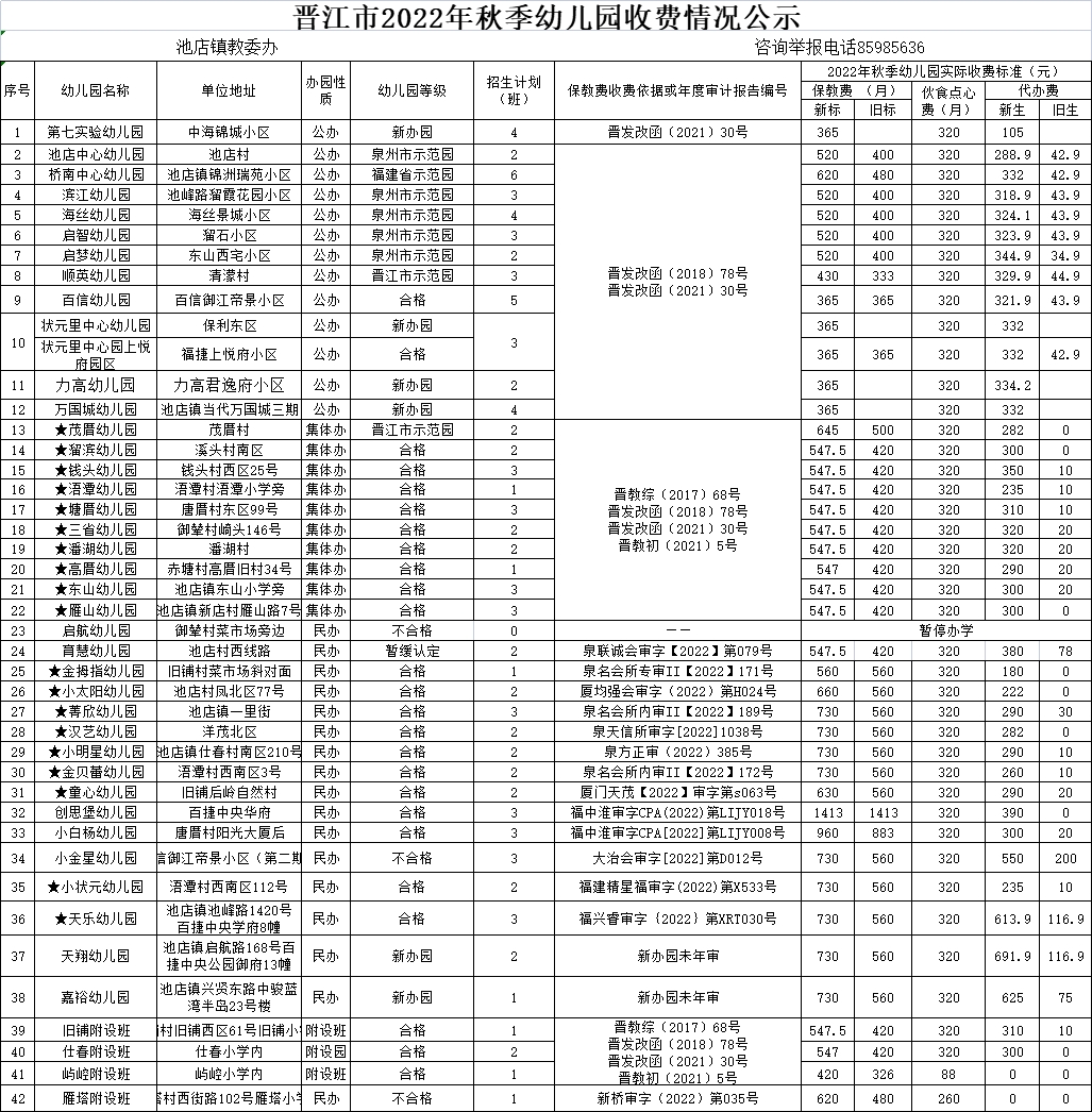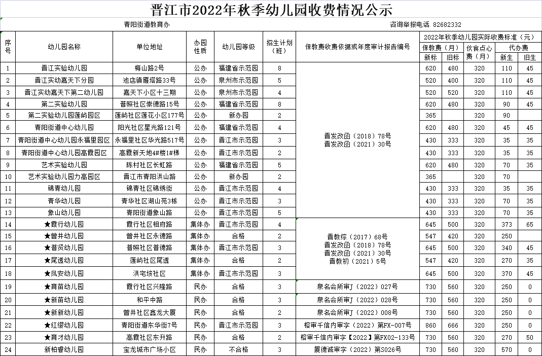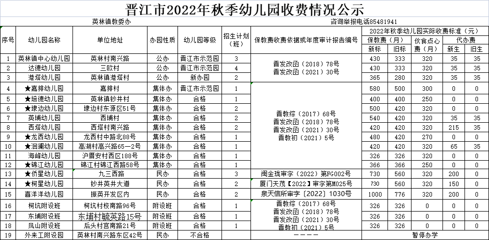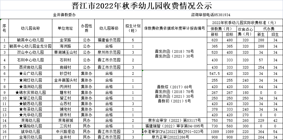 晋江市2022年秋季幼儿园收费公示