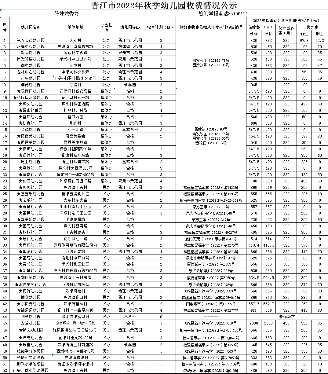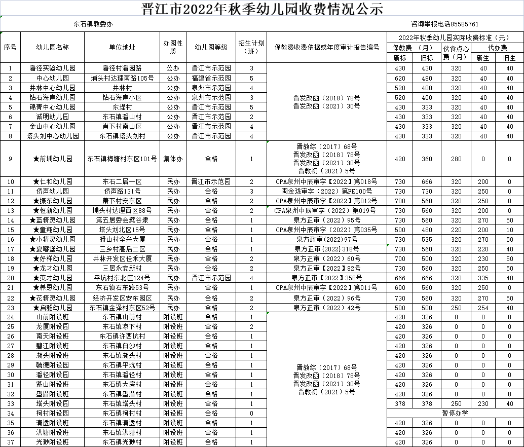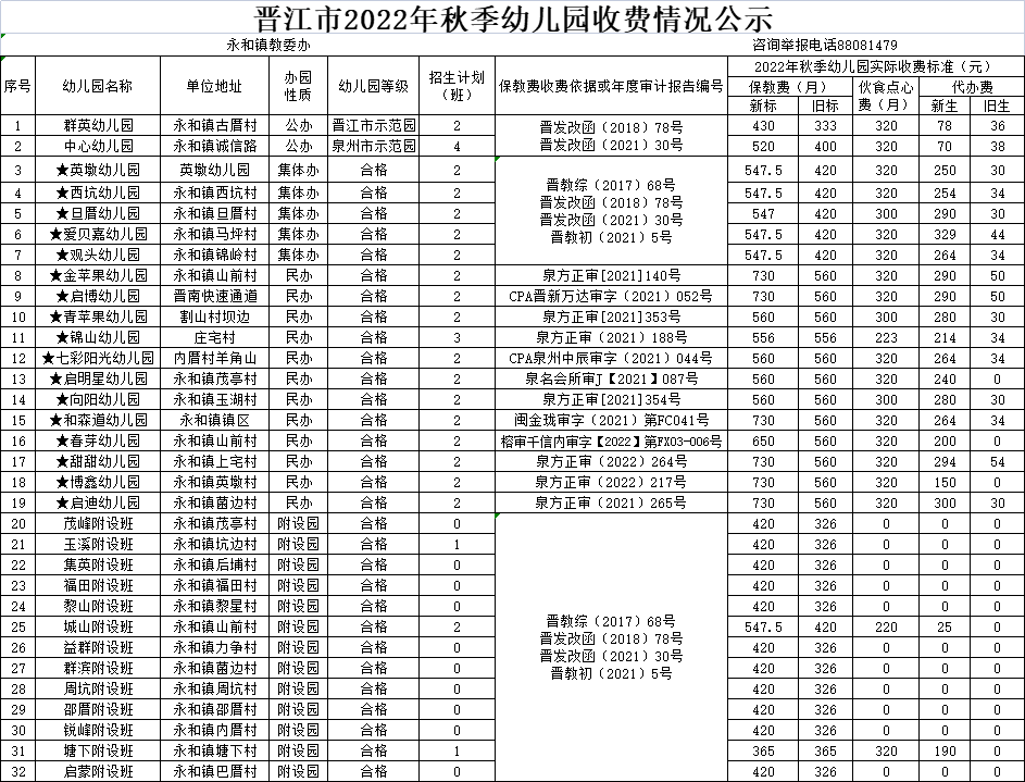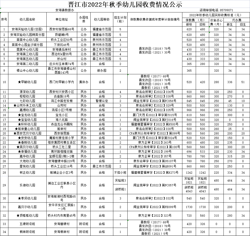 晋江市2022年秋季幼儿园收费公示