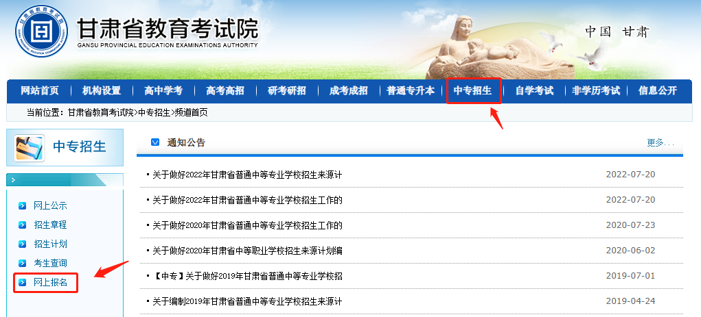甘肃省教育考试院网站,进入“普通中专报名入口”。