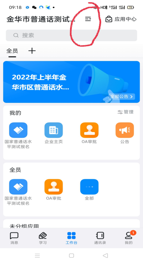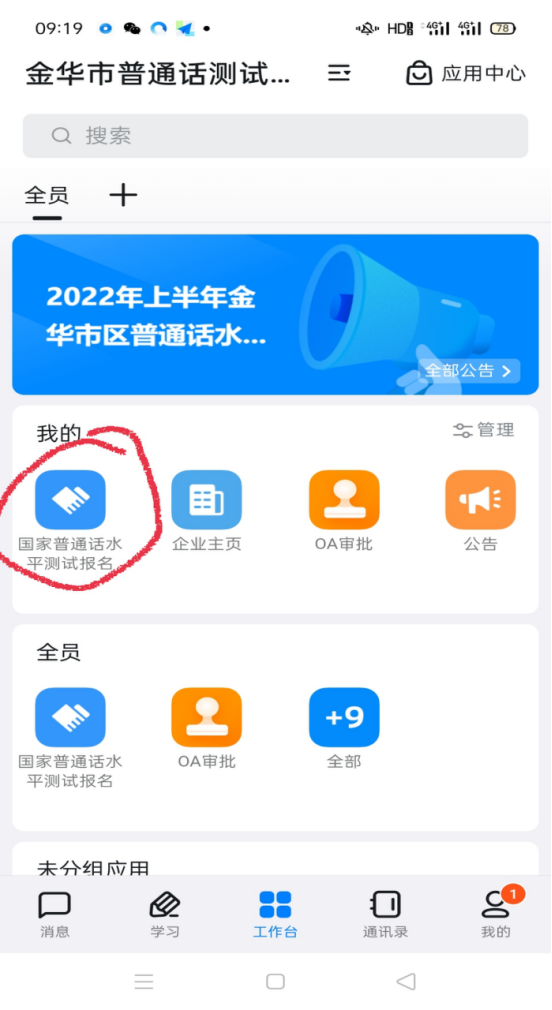 步骤四:点击工作台,选择金华市普通话测试中心。