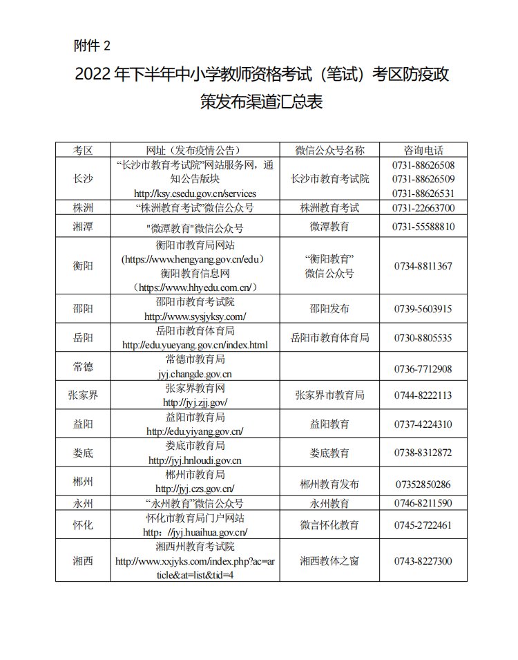 2 . 2022年下半年中小学教师资格考试(笔试)考区防疫政策发布渠道汇总表