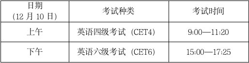 英语四级口语考试(CET-SET4)考试时间为11月19日,英语六级口语考试(CET-SET6)考试时间为11月20日,具体场次安排如下: