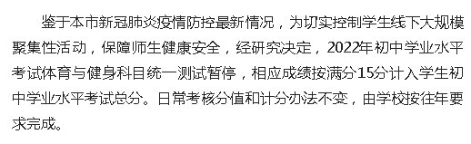 鉴于本市新冠肺炎疫情防控最新情况,为切实控制学生线下大规模聚集性活动,保障师生健康安全,经研究决定,2022年初中学业水平考试体育与健身科目统一测试暂停,相应成绩按满分15分计入学生初中学业水平考试总分。日常考核分值和计分办法不变,由学校按往年要求完成。