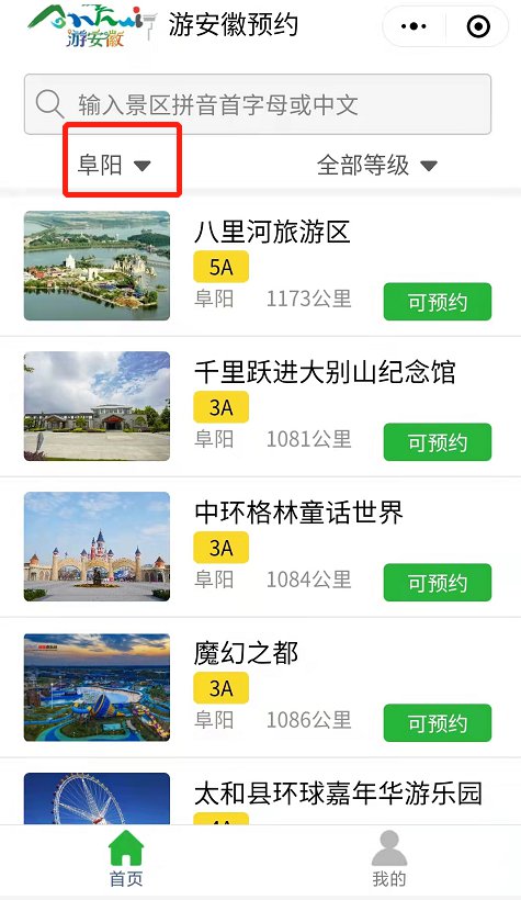 进入小程序首页,默认按照距离由近及远、景区等级由高到底进行景区排序,同时支持按照拼音首字母和汉字模糊查询、支持按照地市、景区等级进行筛选查询。