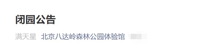 您们好!伴随着第十五届红叶生态文化节进入尾期,天气亦日渐干燥,风力变化较大,森林火险等级高,防火形式严峻,八达岭国家森林公园也进入了防火期。为严防森林火灾,自2021年11月1日至2022年5月30日,八达岭国家森林公园封山闭园。在此期间公园暂不接待游客。请游客朋友们及时关注闭园时间,调整出行计划,以免耽误您的游览行程,敬请广大市民、游客朋友予以理解、支持和配合,由此给您带来的不便敬请见谅。