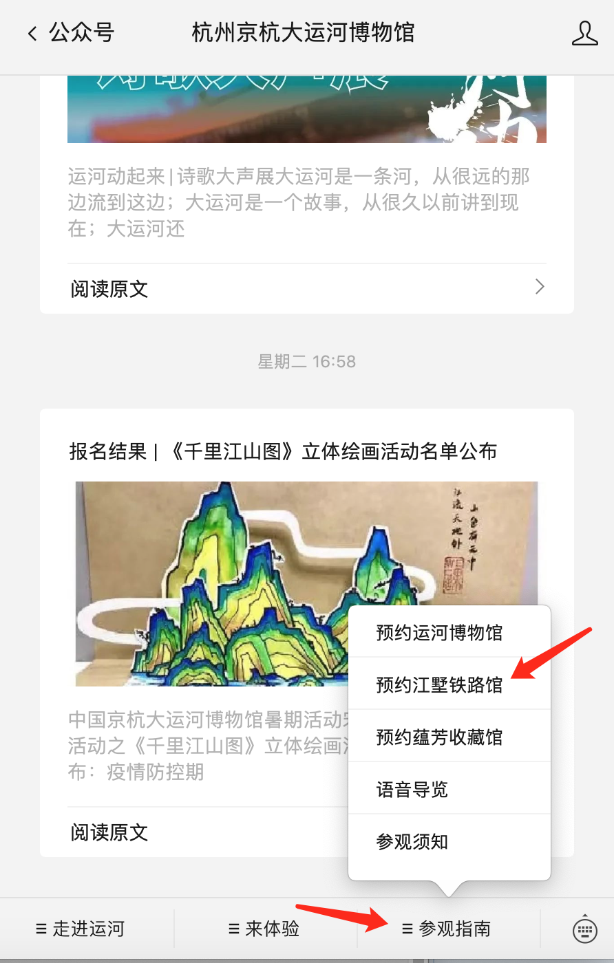 关注微信公众号“杭州京杭大运河博物馆”,点击菜单栏“参观指南”-“预约江墅铁路馆”,即可进入预约页面。