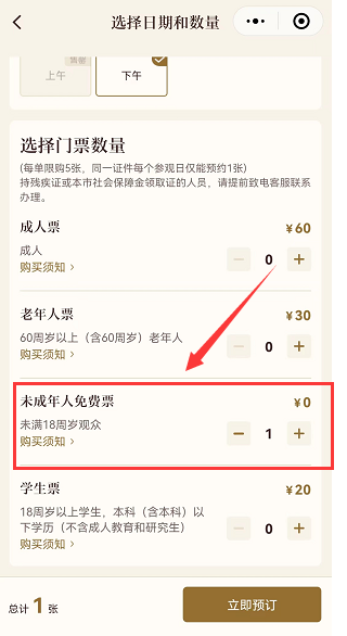 答:线上购票入口,点击【未成年人免费票】预订即可。