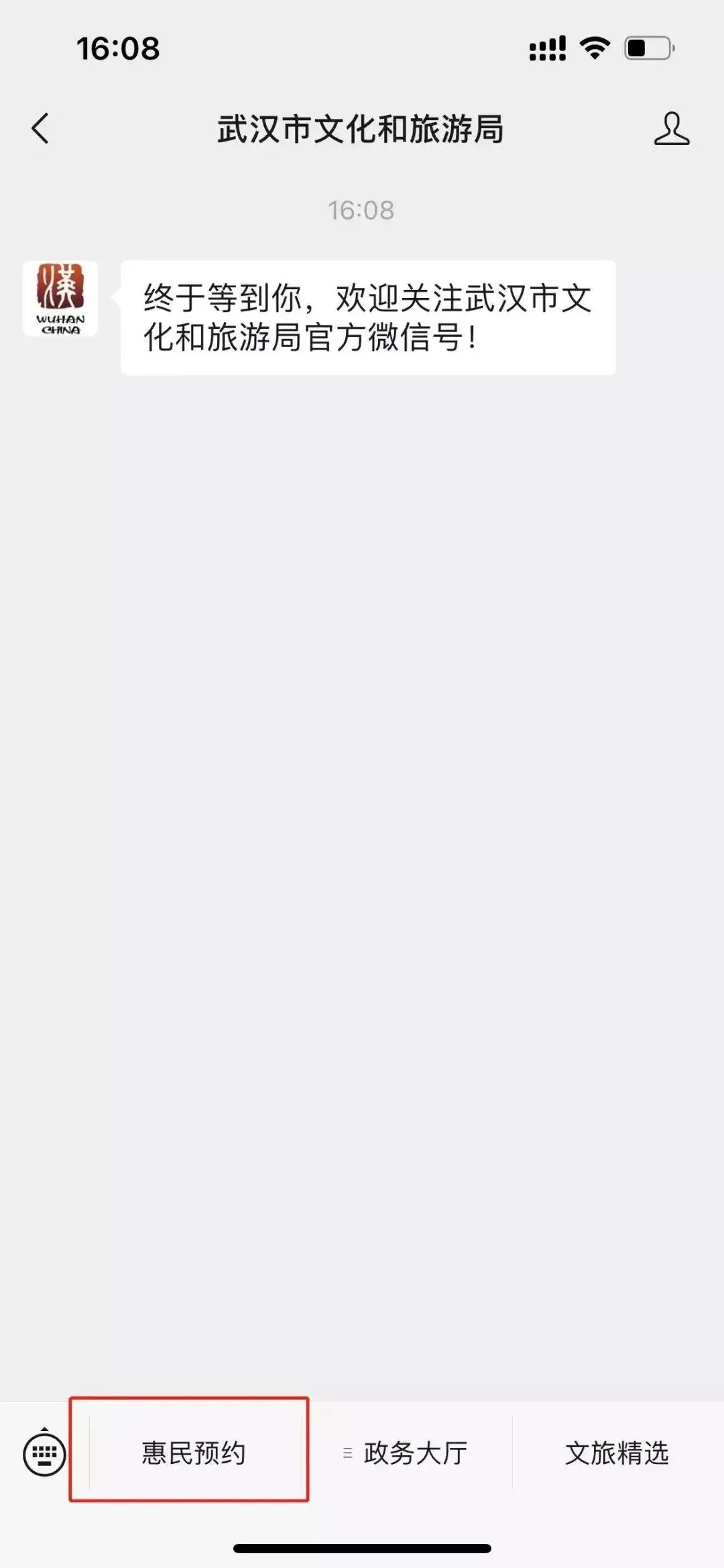 1、进入“武汉市文化和旅游局”官微,点击左下方菜单栏【惠民预约】-【预约通道】进入预约平台小程序。