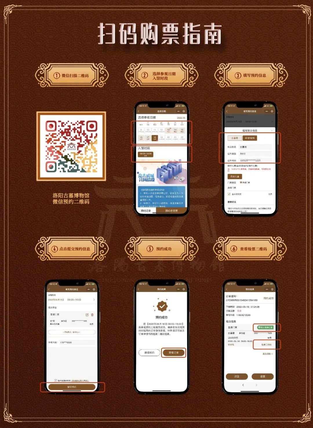 严格实行“五必检”防疫工作法,即“检实名、检绿码、检行程、检体温、检口罩”,强化“无接触”服务。未预约、未按预约日期、未携带本人有效身份证件、证件信息与预约信息不匹配、体温超过37.3℃(含)、场所码、防疫行程卡显示异常或未佩戴口罩的观众,不得进入馆区。
