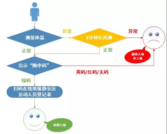 4、主动配合工作人员进行体温测量,出示本人随申码,扫码在线填报《静安区经营性体育场所健身人员登记》。体温低于37.3摄氏度且随申码为绿色者可入场。