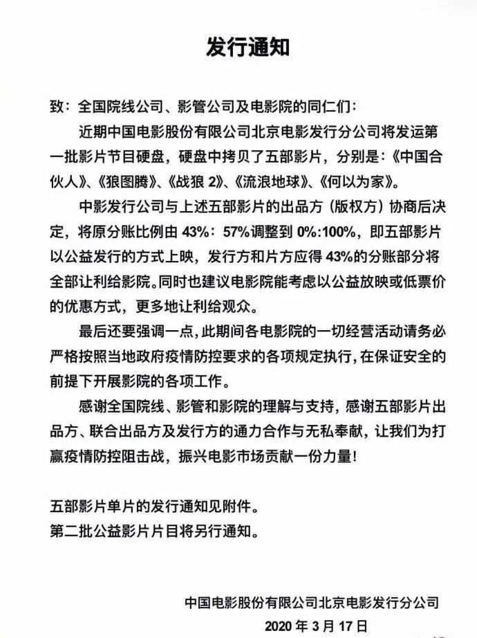 发行通知表示,中影与五部影片出品方协商后决定采取公益发行的方式上映,让利给影院,同时也建议影院以公益放映或低票价的优惠方式让利给观众。也就是说影院恢复运营后,《中国合伙人》《狼图腾》《战狼2》《流浪地球》与《何以为家》这5部影片将会以低票价甚至免费的方式供大家观看。