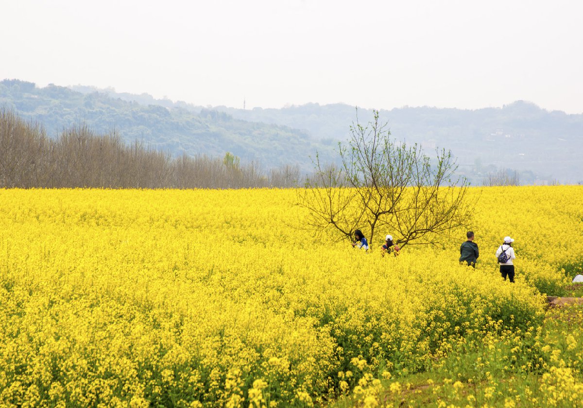 每年3月,在南岸区广阳岛上,千亩的油菜花在春风中摇曳怒放,最忙碌的是那深情款款的蜜蜂和蝴蝶,美得一塌糊涂的田园春光,是属于每个人的乡愁。全岛油菜花观赏点,主要有两处 ,「高峰梯田」和「好大一块田」,其中,「好大一块田」是传统网红打卡点,它面积约300亩,抬头望去,满眼金黄,也是重庆市主城区单块面积最大的农田。
