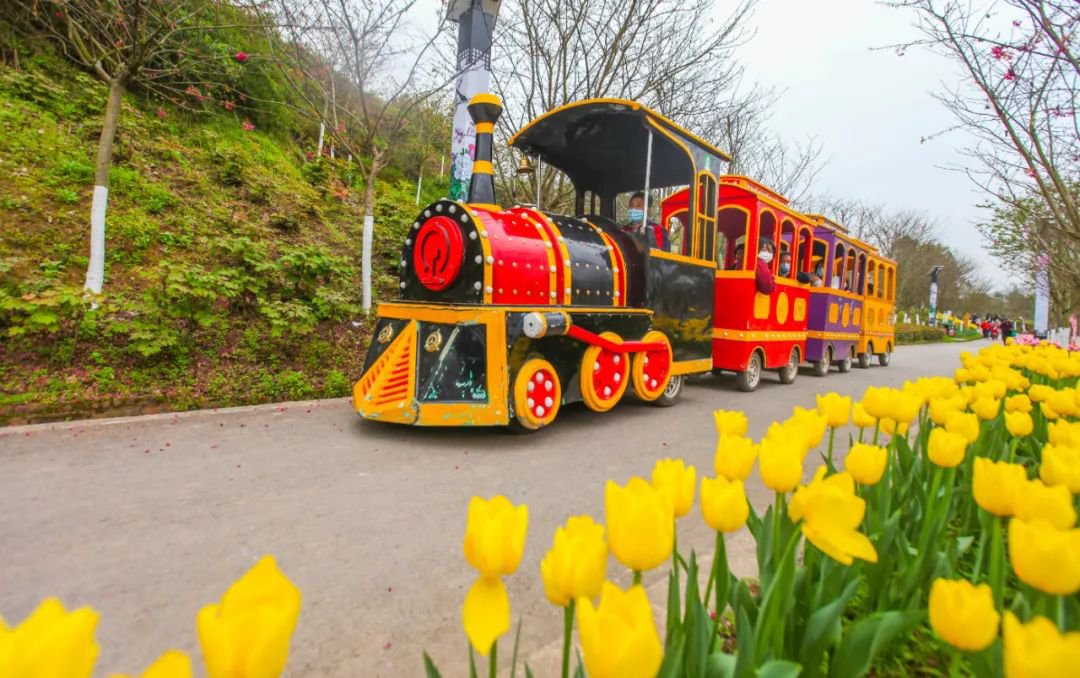 景区内,五颜六色的郁金香竞相绽放,油菜花、樱花、桃花、牡丹花等上百种色彩斑斓的鲜花次第开放,构成了一幅幅春意盎然的画卷。