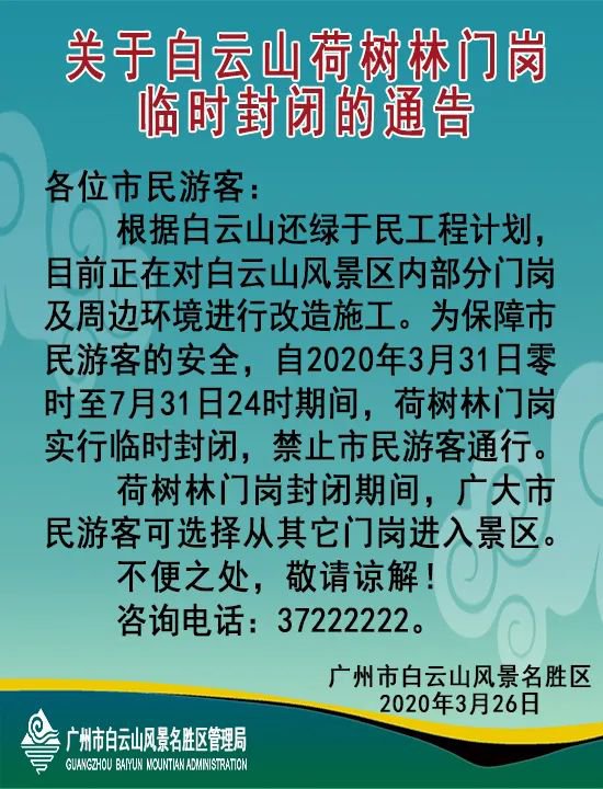 根据白云山还绿于民工程计划,目前正在对白云山风景区内部分门岗及周边环境进行改造施工。为保障市民游客的安全,自2020年3月31 日零时至7月31日24时期间,荷树林门岗实行临时封闭,禁止市民游客通行。