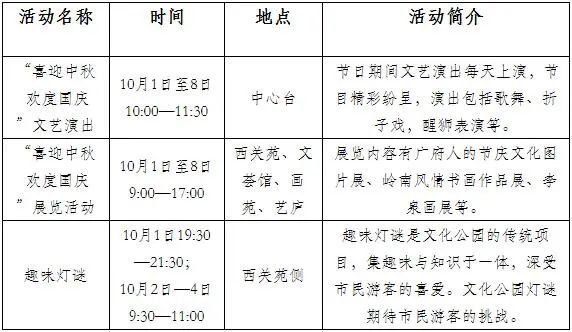 为营造梦幻、唯美的彩灯效果,本届灯会特在部分主题景组设计干冰雾化装置,让灯组产生雾气缭绕的梦幻效果。除了灯组,中秋、国庆期间,文化公园还有文艺演出、醒狮表演、书画展览、趣味灯谜、粤剧折子戏等活动。
