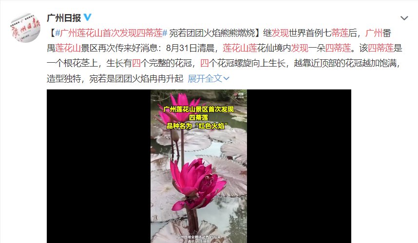 继发现世界首例七蒂莲后,广州番禺莲花山景区再次传来好消息:8月31日清晨,莲花山莲花仙境内发现一朵四蒂莲。该四蒂莲是一个根花茎上,生长有四个完整的花冠,四个花冠螺旋向上生长,越靠近顶部的花冠越加饱满,造型独特,宛若是团团火焰冉冉升起,熊熊燃烧,形成了一个璀璨夺目的火炬。