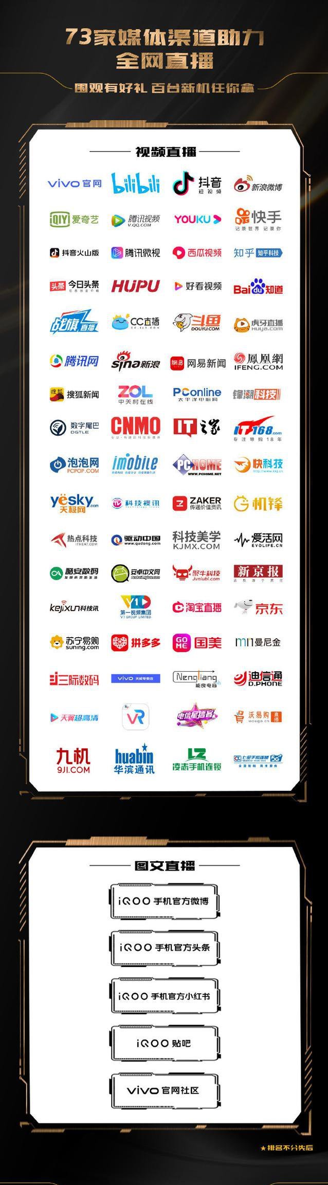 直播平台:vivo官网、bilibili、爱奇艺、腾讯、优酷、抖音等73家媒体频道助力,全网直播