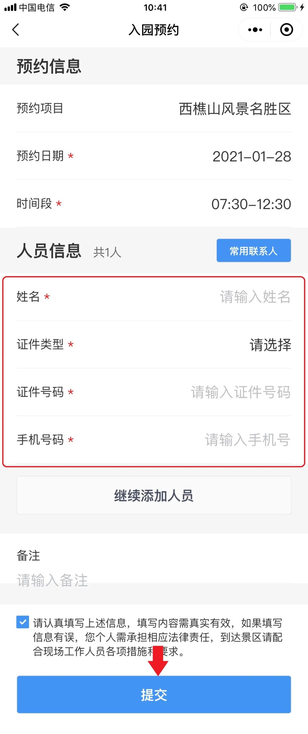 ②进入预约信息填写界面,勾选已阅的注意事项,点击“提交”。
