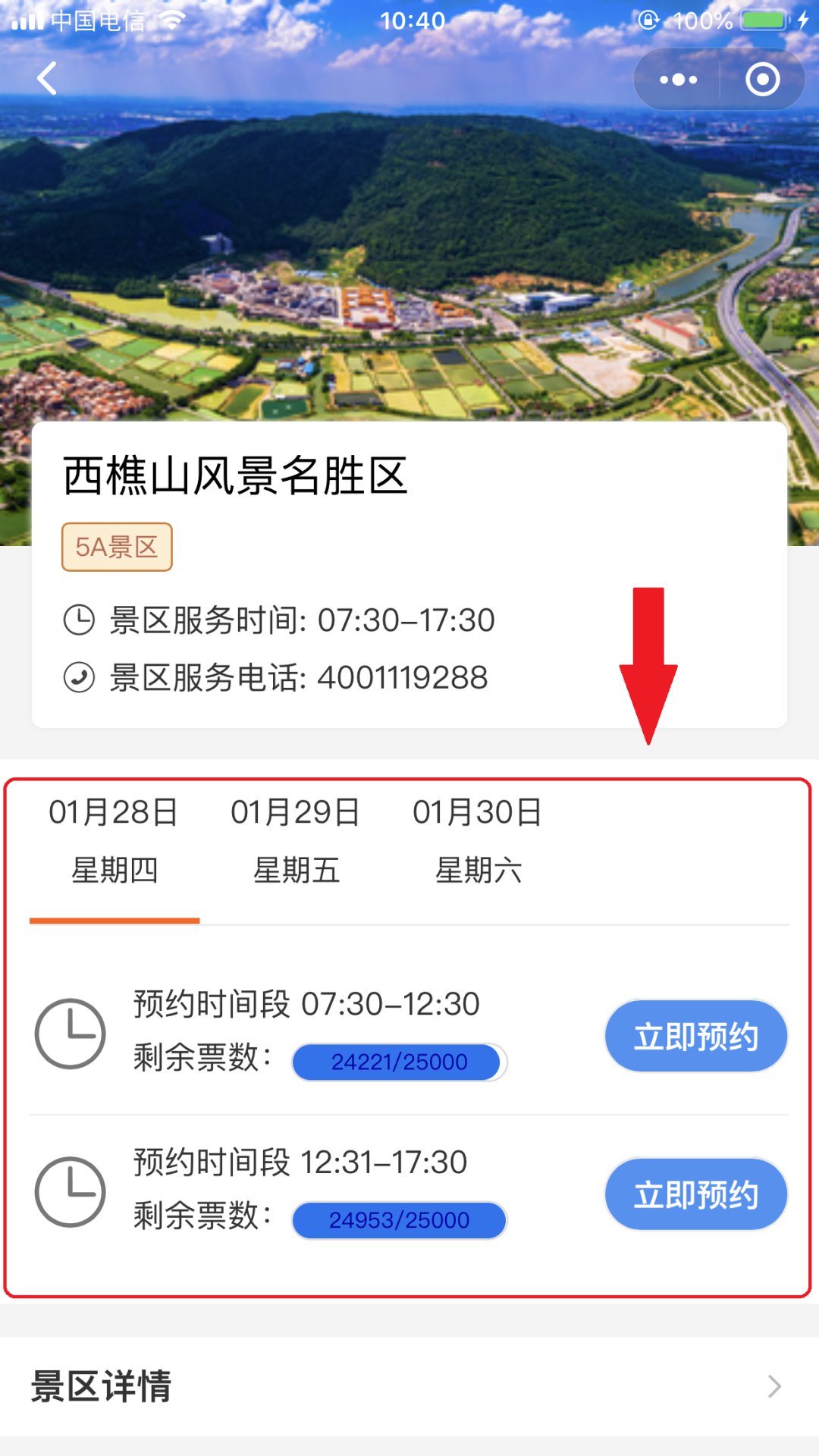 ①进入景点预约界面,选择日期与时段,点击“立即预约”。