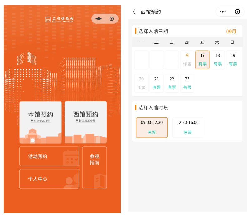 苏州博物馆西馆实行实名制全预约制度,观众可提前七天通过线上渠道(官网及微信小程序)进行参观预约(系统服务时间:每日8:00-23:00),可预约的参观时间分为9:00-12:30和12:30-16:00两个时间段。