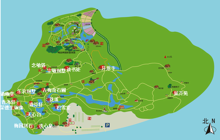 【主要景点】有:梅园刻石、洗心泉、米襄阳拜石、天心台、揖蠡亭、清芬轩、香海、诵豳堂、招鹤亭、小罗浮、念劬塔、豁然洞、开原寺、松鹤园、小金谷、吟风阁。