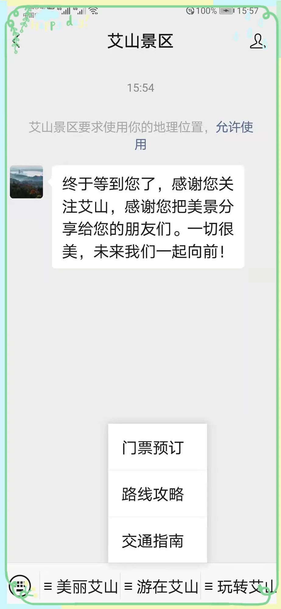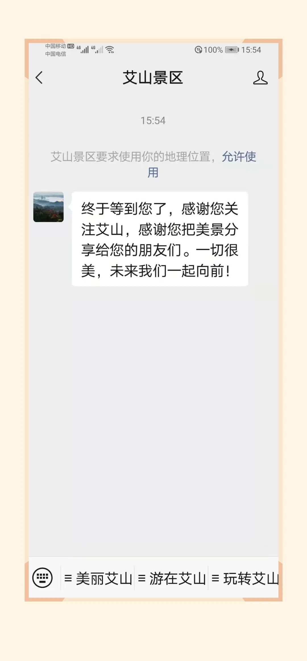 1、艾山景区官方微信公众号子菜单预约购票、进入“艾山景区”公众号主页面,点击菜单栏“游在艾山”