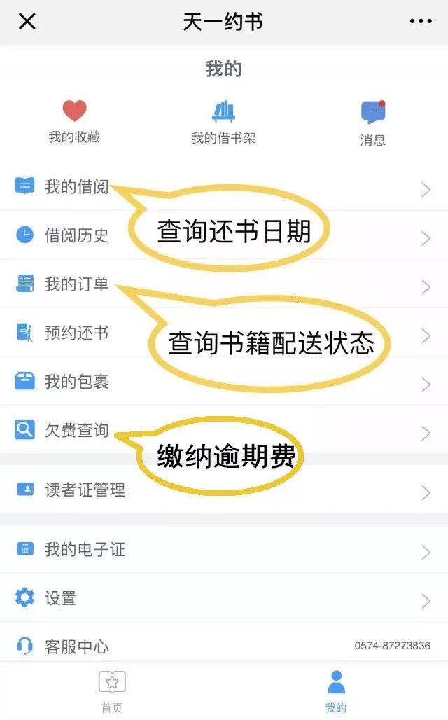 “天一约书”图书逾期未还,须缴清逾期费并归还图书后才能继续借书。(逾期费为每天0.1元/册)